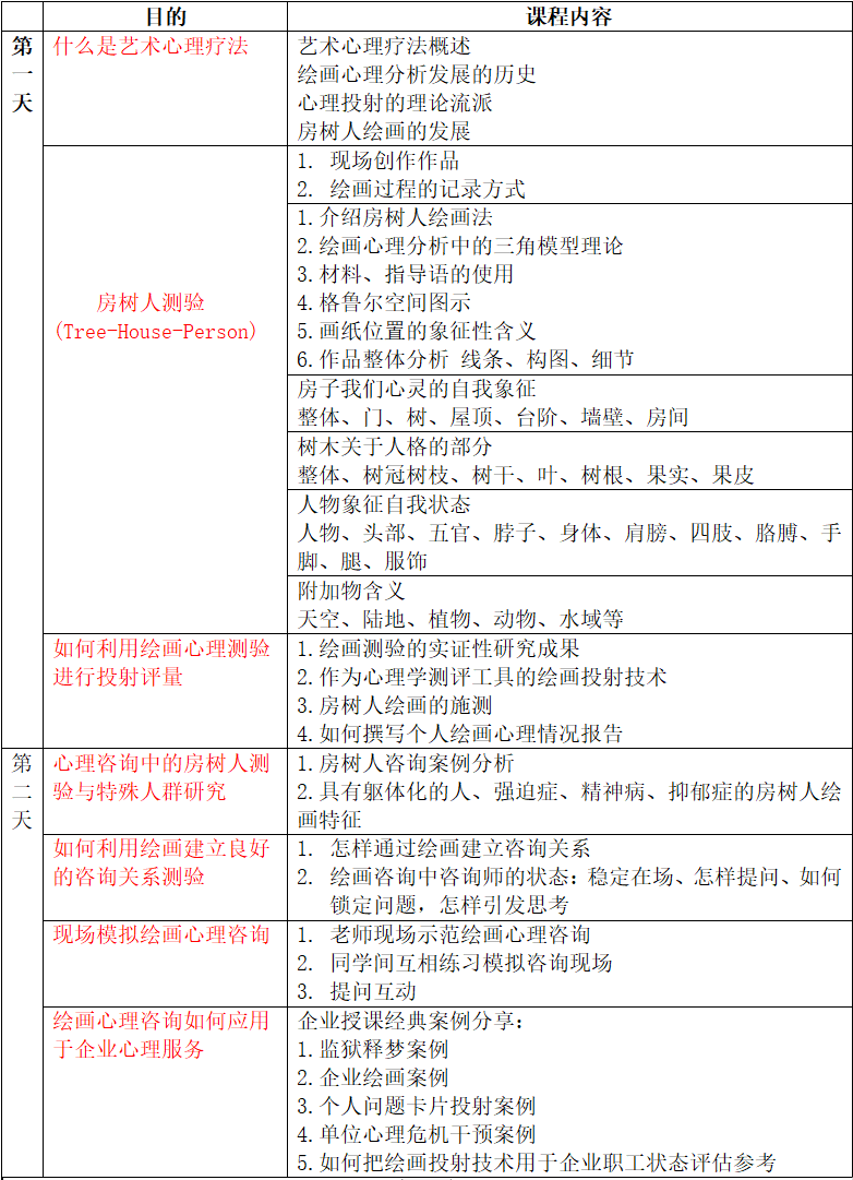 1. 【心理专业提升】系统学习专业心理绘画知识 2. 【深入自我探索】能有效触及原生家庭关系、自我成长中的问题 3. 【心理咨询实用技术】学习完后本技术可直接用于一对一咨询 4. 【企业培训辅助技术】在企业培训、学生辅导、管理咨询、人才招聘等工作中可有效结合运用。