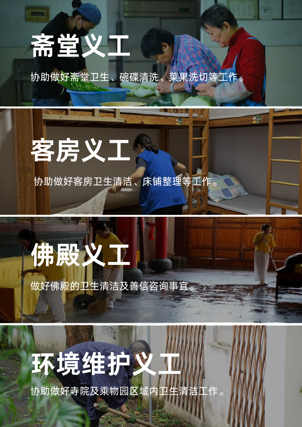 能自觉服从寺院安排的义工岗位。