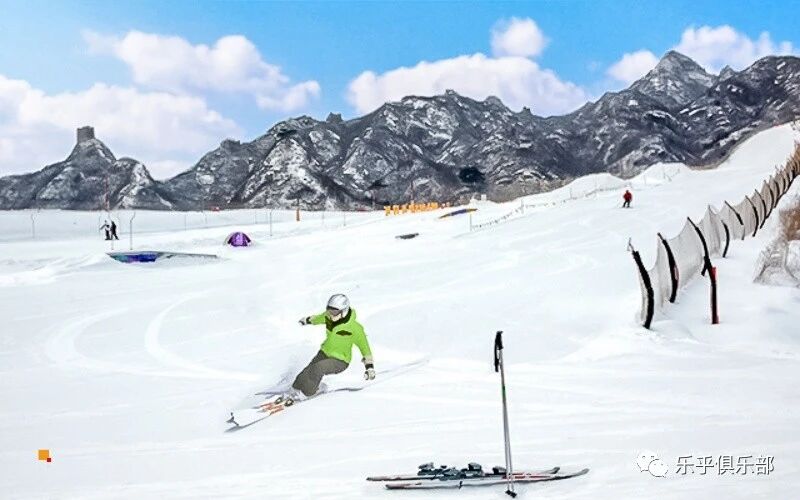长城三面环绕,万里长城中唯一的"夹扁楼"就在雪道旁。