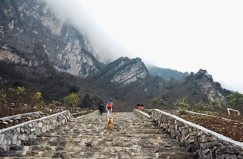 从山上桥湾垭口到谷底桥湾,垂直落差500多米,从悬崖上凿路下去,因用了数十道“之”字拐,则要走1000多米。当地人叫"四十二拐"的山间小道共有1520级台阶,差不多一公里路。这种特殊的地势使得鹿院坪的山水林田路及农舍至今保持原生态。