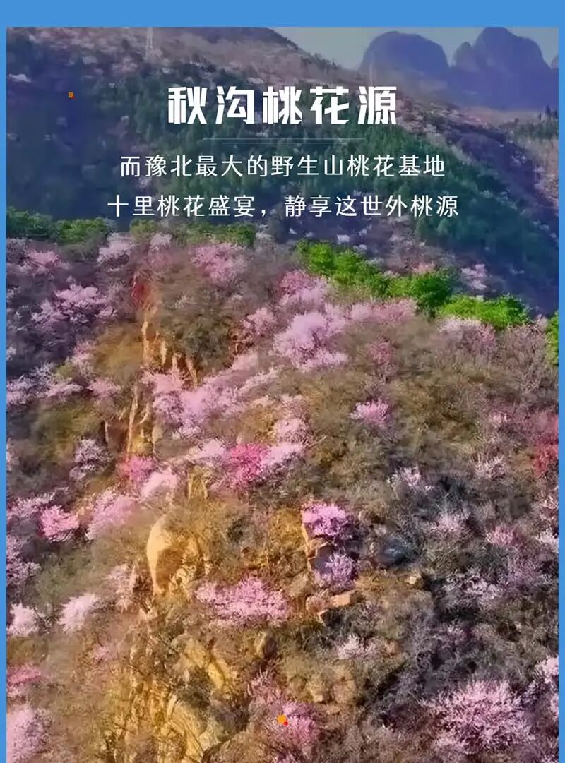 桃花美景:秋沟是豫北最大的野生山桃花基地,景区内漫山遍野的桃花迎春绽放,粉色的花朵与红色崖壁相互映衬,美如画卷。桃花从山下到山上、由阳坡到阴坡次第开放,初花期为 3 月 12 日至 3 月 22 日左右,盛花期从 3 月 23 日开始,能维持到 4 月 15 日左右。