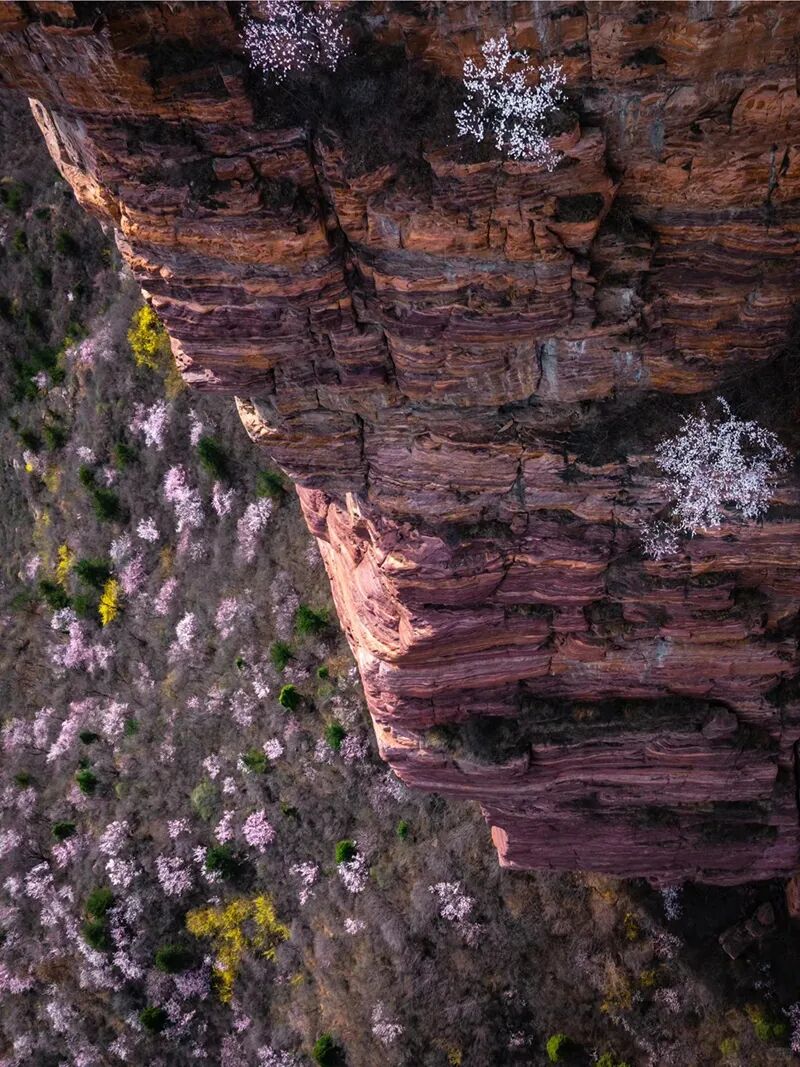 每年三月,河南新乡秋沟景区的桃花漫山遍野、竞相绽放,粉白相间的花朵与红色崖壁交相辉映,宛如世外桃源,吸引着无数游客前来观赏。