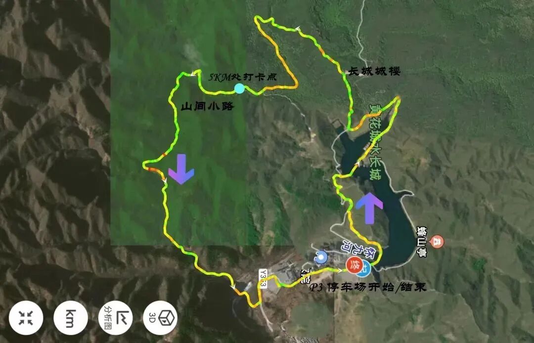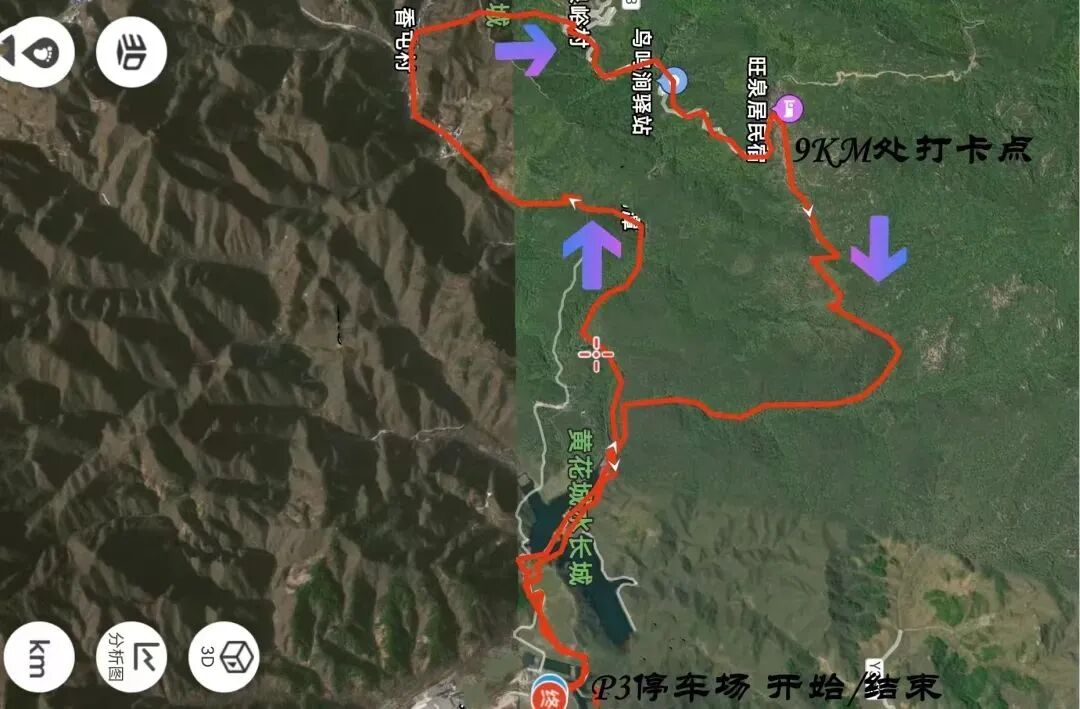 路线:P3--半岛—沙滩一板栗园-长城一三楼山路-公路-山间小路-P2停车场—P3停车场