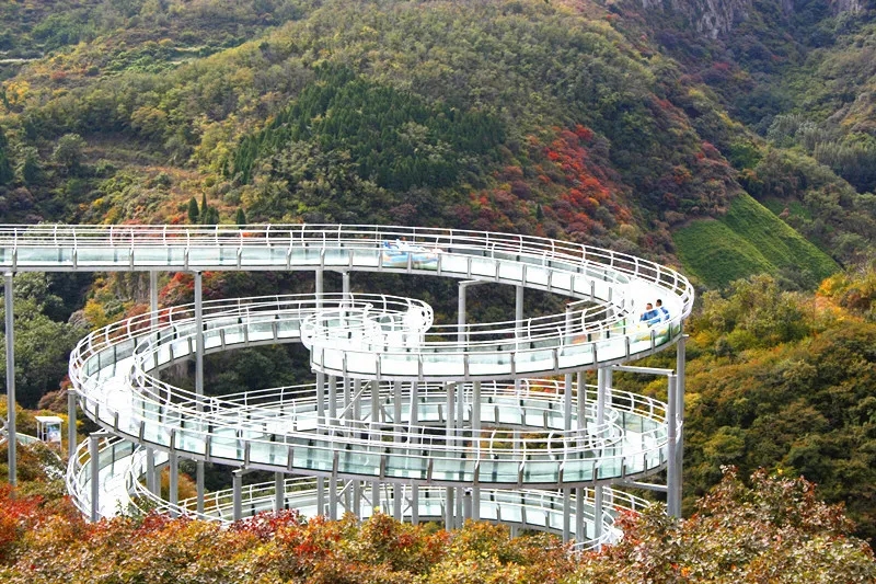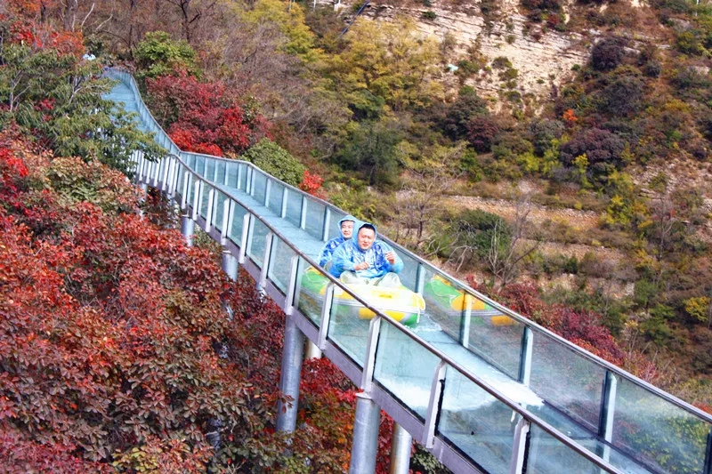 打卡理由:网红玻璃水滑道是全长2020米的高空玻璃水滑道,结合了玻璃速滑与水中激情冲浪,在感受高空呼啸而过的刺激时,又能体验驾驭飞舟激流冲浪的豪情。高空玻璃水滑道坐落于群山巨石之间,底面和两侧都由全透钢化玻璃组成,游客穿戴好防护防水设备后,坐在气垫船上顺滑道而下,沿途经过五个托马斯大回旋,悬浮于空中的溪流中任意穿梭。