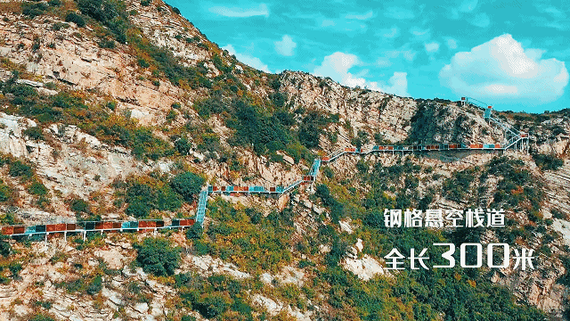 【钢格悬空栈道】:钢格悬空栈道全长300米,悬挂于歪嘴山崖壁之上,最高处距地面50米,桥身采用奥地利钢格悬空结构,山间奇巧,飞梁绝壁,惊险万分!