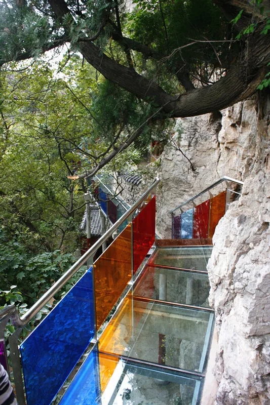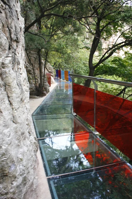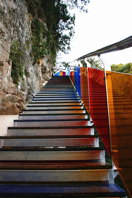 【七彩悬空玻璃栈道】:七彩悬空玻璃栈道全长260米,依崖壁顺势而建,最高处距地面70余米,起点为天然的洞穴“一线天”,踩在这里感觉腾云驾雾,如履薄冰,有一种飘飘然的感觉,但也有不同凡响的心惊胆战!