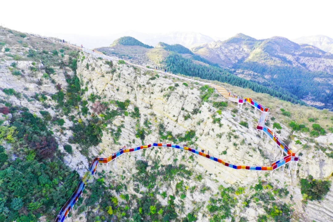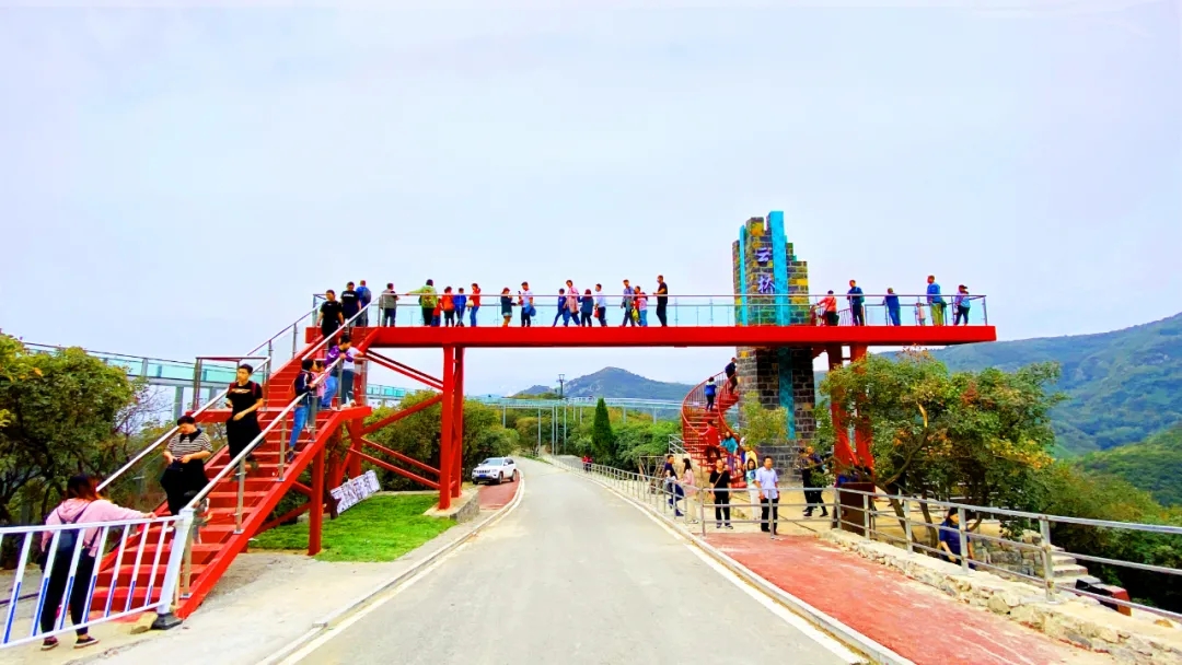 还有通身全琉璃打造流光溢彩,令身心安乐有可以观赏万亩红叶林的绝佳地点【云桥】,有在原来古道的基础上增设挑空设计,最大程度还原齐长城原貌的【齐长城文化长廊】,还有最高处距地面55米,横跨悬崖之间的空中走廊【悬空吊桥】,幽远静谧的【竹林】;深189米,四季长流的【炉神涌泉】;民国末年中国十大地主之一孙宝森的宅院【地主大院】;也可以去【圆梦环】诚心祈祷,可圆梦中所念,实现心中所想;占地近30亩,台地16层,寓意花好月圆的【花海】等二十多个美景打卡地!(景区观光车自愿自理)