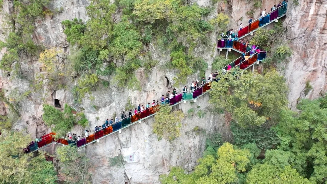 打卡理由:七彩琉璃栈道全长300米,依崖壁顺势而建,最高处距地面70余米,起点为天然的洞穴“一线天”,犹如一道彩虹桥通向云端,在云雾中若隐若现。行走之上如云中漫步,置身于仙境之中,是邂逅浪漫必选之地。